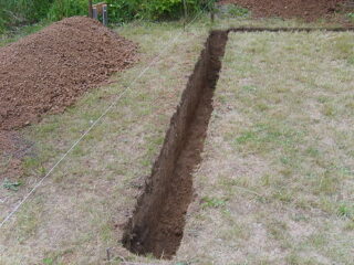 De petites tranchées sont creusées à la main à l'aide d'une pelle à baïonnette et d'un pied de biche. Les racines dans le sol sont coupées à la hache. Pour une fondation longue, une grande quantité d'excavation sera nécessaire, par conséquent, une méthode mécanisée utilisant des excavatrices est utilisée.