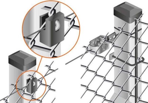 Il existe une option lorsque les éléments du cadre sont réalisés avec des crochets sur lesquels sont accrochés les maillons de maille. Ensuite les épingles (3 mm) sont pliées avec une pince, les bords sont fixés par soudure pour que la toile ne glisse pas. Les sections aux piliers de support sont fixées au moyen de plaques métalliques soudées.