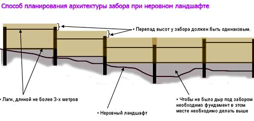 Si une clôture est construite sur un terrain plat, il n'y a aucune difficulté avec le marquage. Une clôture sur une surface en pente nécessite une attention particulière, car les supports devront être creusés à différents niveaux. En même temps, le maillage est étiré de sorte que son bord soit parallèle à la ligne conditionnelle de connexion des sommets des supports.
