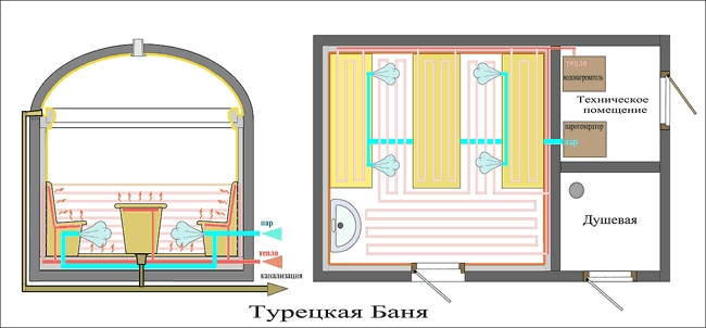 Ayant décidé de construire un hammam à domicile, vous devez avoir une idée de la structure des futurs locaux. En Turquie, il se compose d'au moins trois sections - un dressing, une salle de bain et un lieu où se déroule la procédure principale.