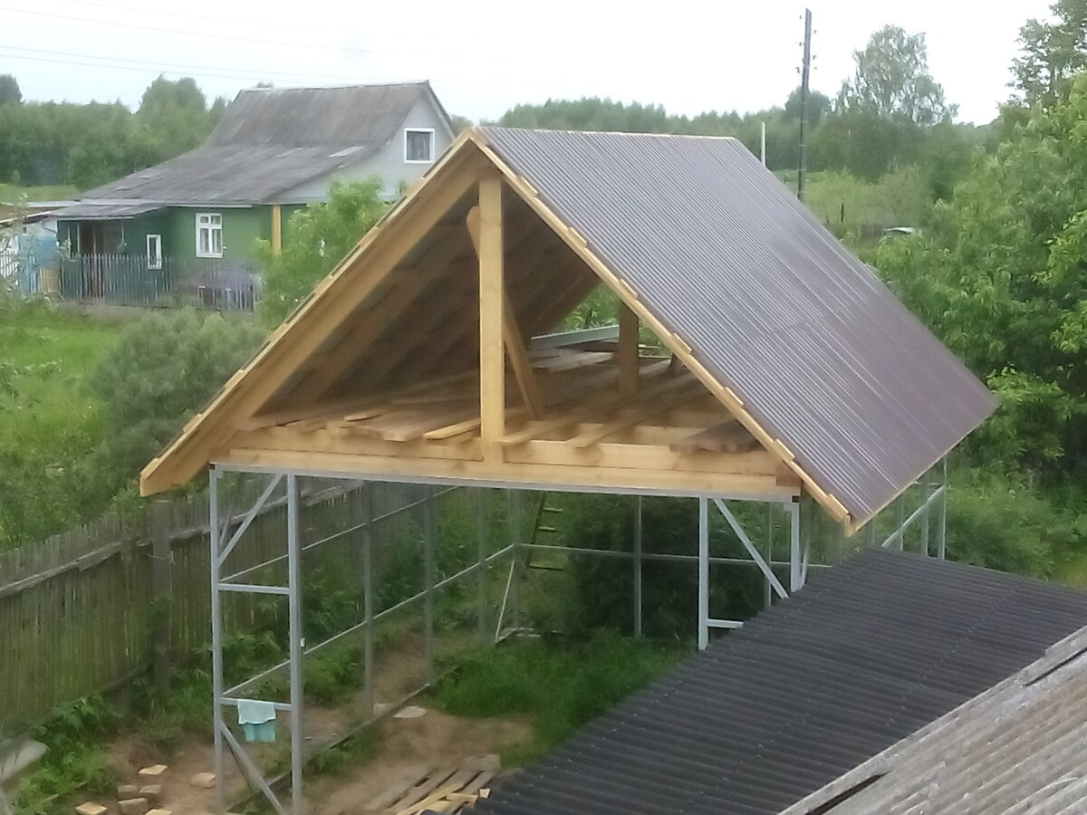 Le travail commence par la préparation du système de chevrons. Ensuite, la caisse est montée et le matériau de toiture est posé dessus.