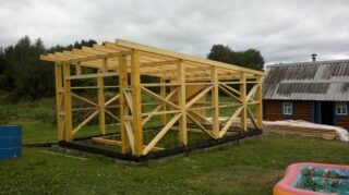 Ils planifient un toit en pente ou font deux plans inclinés. Pour la première option, d'un côté, des supports plus hauts sont prévus, sur lesquels sont placées des poutres, qui jouent le rôle de chevrons. Avec un toit à pignon, les supports verticaux sont faits de la même hauteur, mais les fermes sont faites. Ils sont posés sur les poutres de plancher fixées à la ceinture de cerclage supérieure.