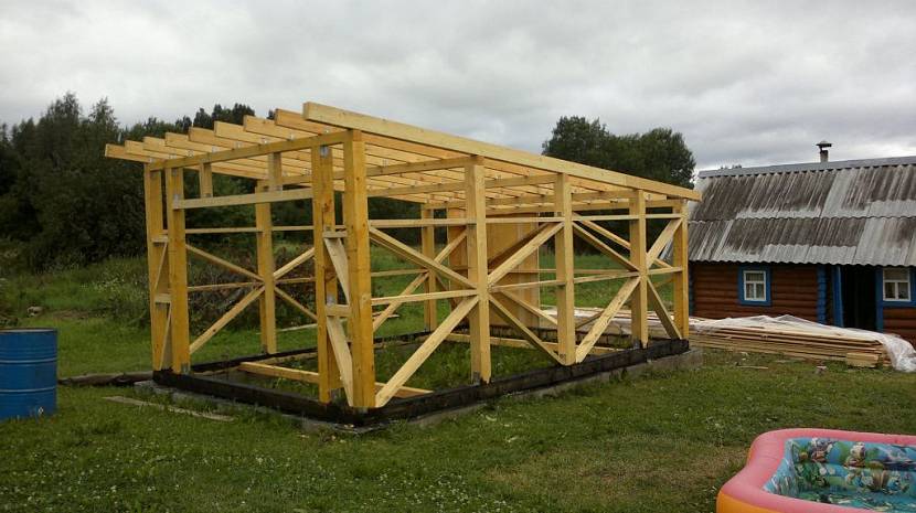 Parfois, ils aménagent un toit plat, mais cette conception a également une légère pente (10 - 15 °). Avant l'installation, les chevrons ou les pièces de ferme sont traités avec un antiseptique. Les éléments de chevrons sont reliés les uns aux autres avec des supports, des boulons, des coins métalliques.