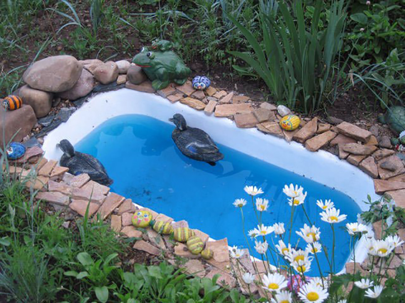 Une baignoire est une bonne idée pour un étang. Ils utilisent des cuves en acier, en terre cuite, en acrylique qui ont fait leur vie. Ce dernier peut avoir des contours très divers et intéressants, ce qui sera un plus supplémentaire pour un réservoir décoratif.