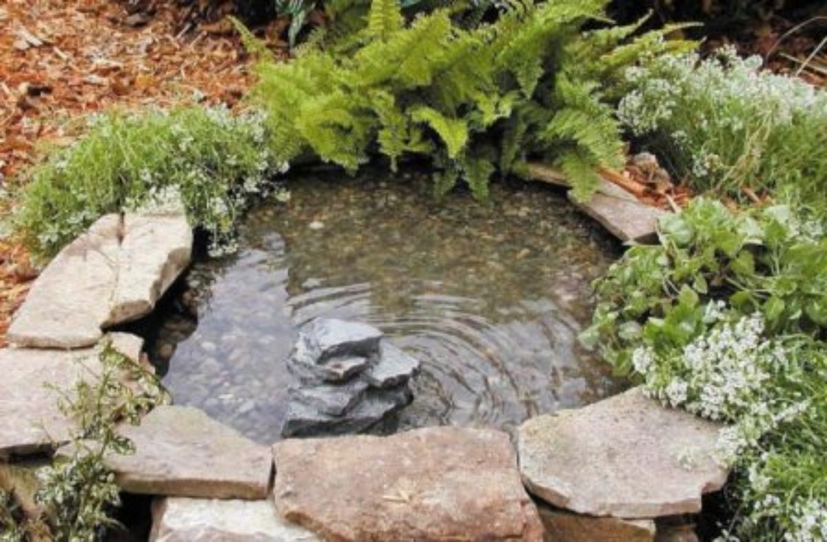 Des pots de fleurs, des citernes, des tonneaux, des pots sont utilisés comme réservoir pour l'étang.