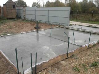 - Le béton est coulé avec une couche de 10 cm Les proportions de ciment, sable, filler 1: 2,5: 3,5. Par temps chaud, renversez de l'eau toutes les deux heures pour éviter la formation de fissures.