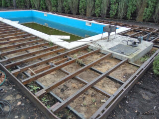 Le pont pour l'installation du platelage est fabriqué selon le principe habituel à partir de bois de rebut. Le coût élevé de la terrasse limite son utilisation uniquement au revêtement des marches et de la terrasse devant la piscine. Les supports pour le cadre sont bétonnés dans le sol.