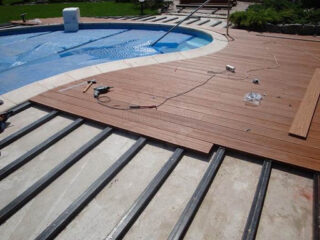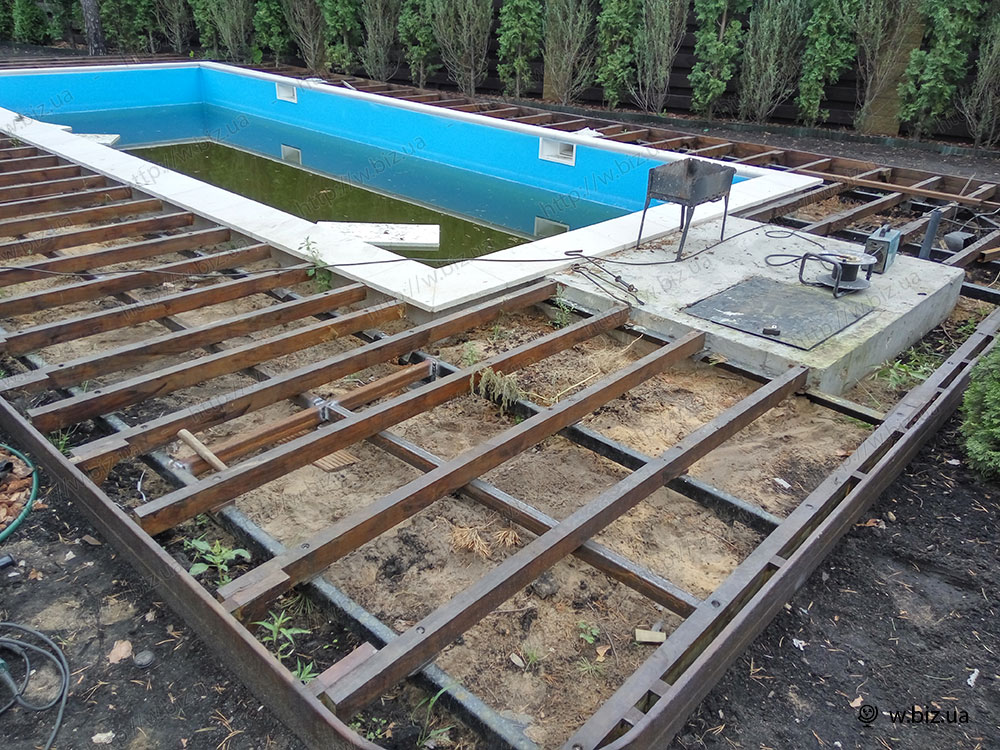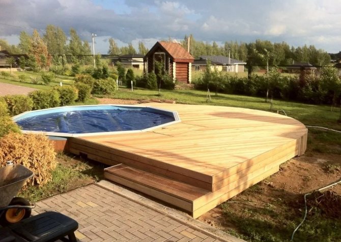 Le parquet est fait uniquement pour le passage à la piscine ou ils aménagent une large terrasse pour se détendre au bord de l'eau, où sont installés bancs, fauteuils, transats. Avec une fonctionnalité accrue, un cadre plus puissant avec des charges accrues est fourni.