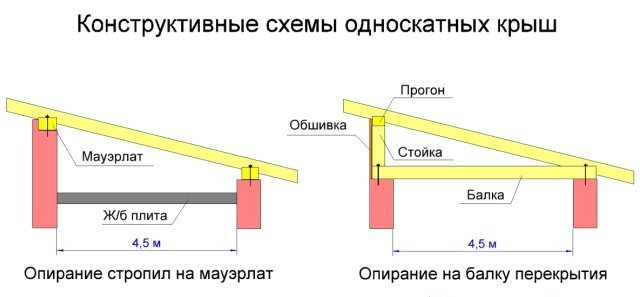 Un toit en pente est formé à l'aide de chevrons installés séparément reposant sur des murs de différentes hauteurs. Le rôle des murs peut être joué par des éléments individuels des structures à ossature (piliers, colonnes, etc.)