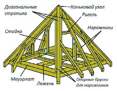 Malgré la variété des schémas d'exécution, le système de chevrons du toit en croupe a toujours un certain nombre d'éléments constants. Pour effectuer correctement les calculs, déterminer les dimensions des pièces constitutives et faire un dessin, vous devez avoir une idée de la structure de la structure.