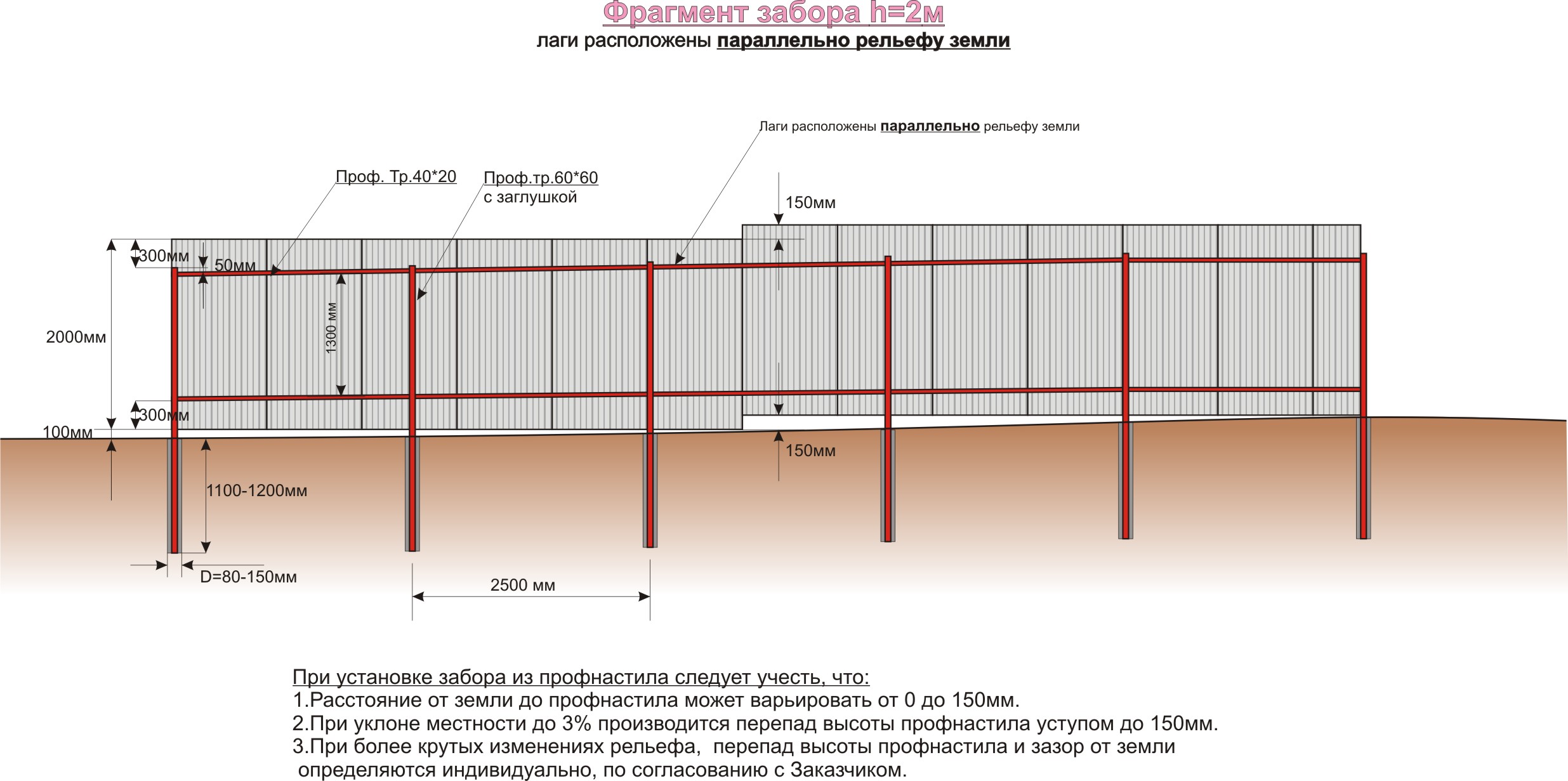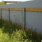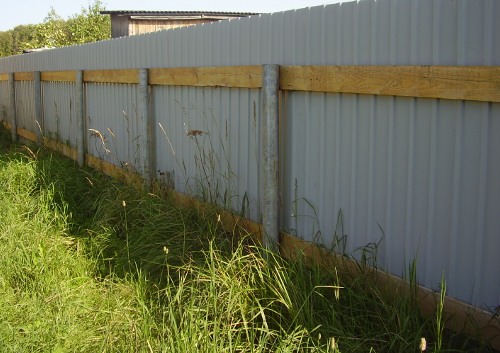 La structure prolongée comprend des piliers fixés dans le sol ou sur la fondation, des solives de liaison, des panneaux de tôle profilée. Si la clôture ne dépasse pas 1,5 m, les bûches sont placées au-dessus et en dessous, et à une hauteur plus élevée, une poutre intermédiaire est placée.