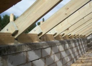 Mauerlat est posé le long des murs porteurs où reposeront les pieds des chevrons.L'arbre à la jonction est imperméabilisé avec un matériau de toiture. La pente du toit est prévue à partir de 20° afin qu'une masse de neige ne s'accumule pas sur les pentes et ne crée pas de charge supplémentaire sur les murs.