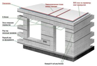 En raison de la fragilité accrue, une ceinture en béton armé est réalisée avant d'installer les poutres le long du périmètre des murs. La largeur de la structure est égale à la largeur du mur, la hauteur de la ceinture est comprise entre 10 et 20 cm.Le nombre d'inserts de renforcement et le diamètre des tiges dépendent de la portée entre les murs porteurs et sont pris par calcul.