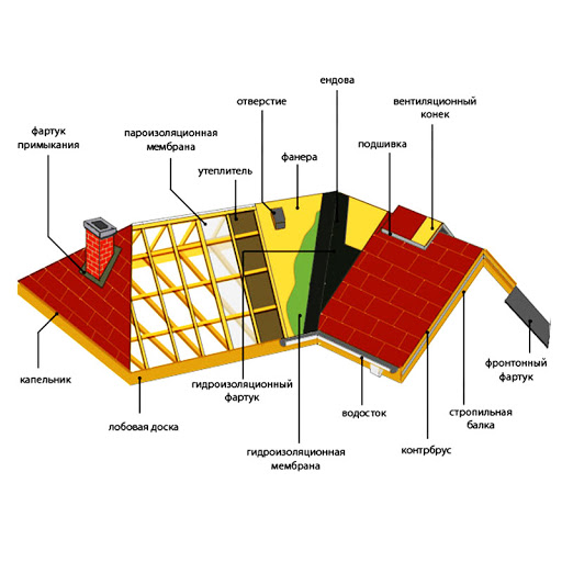 - Érection de toit. Un système de chevrons est réalisé, une imperméabilisation, une couverture de toit est posée.