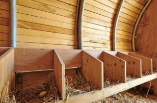 - Nids de taille standard 300x300x400 mm, à raison de 1 nid pour 2-3 oiseaux. Lorsqu'il est disposé en 2 rangées, la hauteur du sol au premier niveau est de 500 mm, au second - 900 mm. Afin de ne pas entrer dans la salle de collecte des œufs, les nids, si possible, sont équipés de trappes sur le côté du mur extérieur.