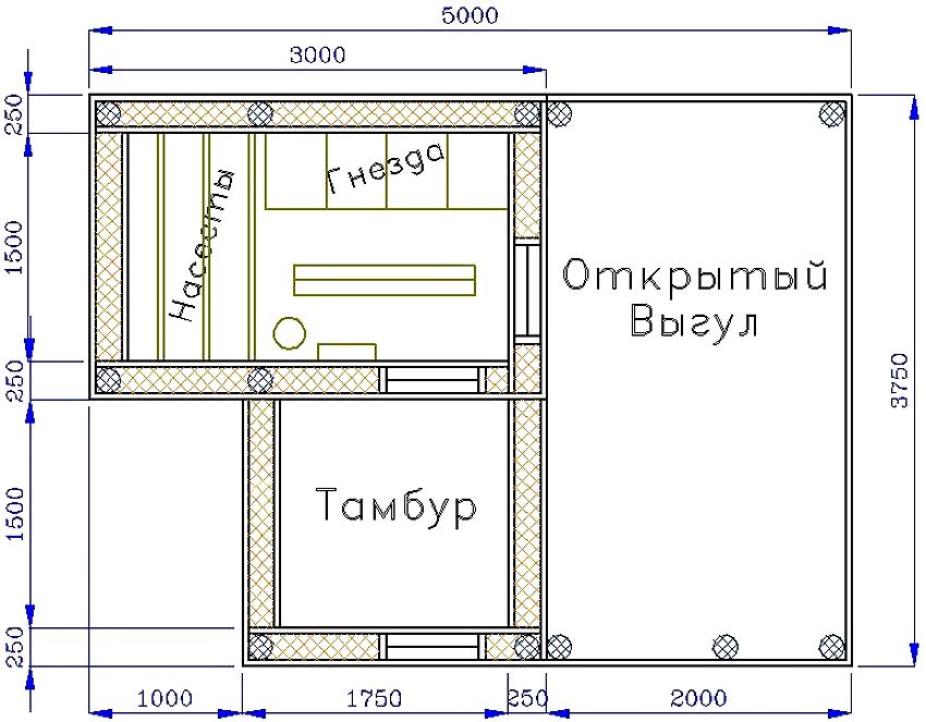 La version été n'est pas isolée. Le bâtiment peut ressembler à une zone clôturée avec un petit hangar pour que les oiseaux y restent la nuit. Lors de la construction d'un poulailler d'hiver, les murs sont isolés de haute qualité. Le compartiment poussette est fait petit, ouvert au soleil.