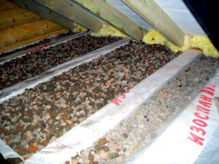 Pour l'isolation thermique, vous pouvez utiliser de la sciure de bois, de la tourbe, de la terre noire et des scories. L'épaisseur pour un grenier froid est de 25-30 cm, pour un grenier - 20-25 cm.