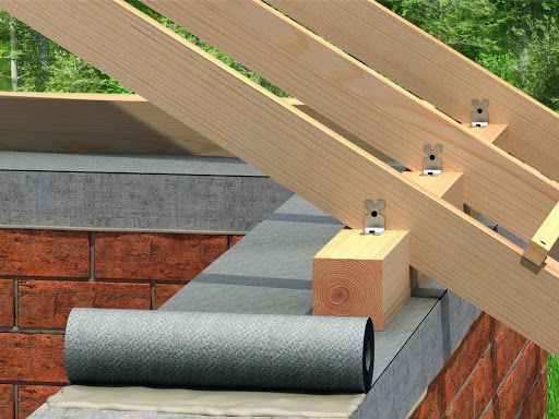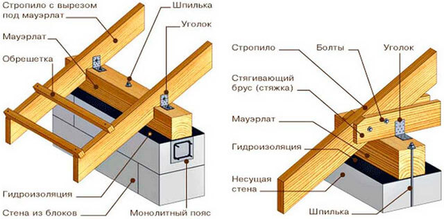 - Pose du Mauerlat. Une couche d'étanchéité est préalablement posée entre le mur et le bois, des poteaux encastrés dans la couronne supérieure ou une rangée de briques / blocs, ou des ancrages sont utilisés pour la fixation. Il est conseillé de traiter la barre Mauerlat elle-même avec des produits ignifuges et des agents antifongiques.