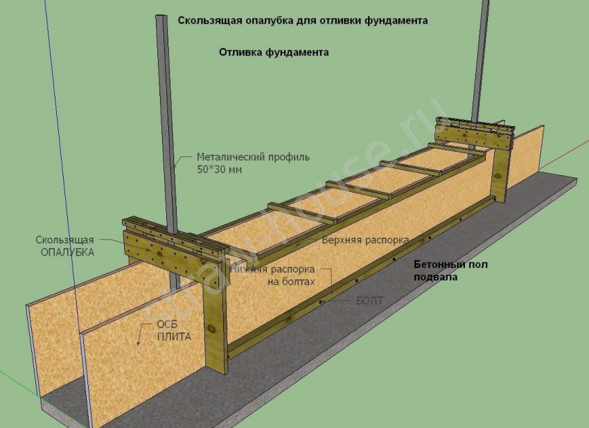 Le coffrage coulissant de bricolage est un processus complexe et coûteux qui nécessite une préparation minutieuse et une expérience du soudage. Le problème principal est l'hydraulique. Il peut être remplacé par de puissants vérins contrôlés par la force musculaire au commandement général du contremaître. Il est conseillé de réaliser un mécanisme avec des boucliers étroits, ce qui simplifiera le contrôle.