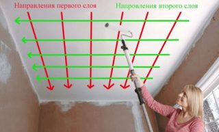 Un gonflement de la peinture et sa suspension au plafond sous la forme d'une coquille apparaît si, après le meulage de la couche de mastic, la surface du plafond n'a pas été surapprêtée. La composition est appliquée au rouleau ou au pistolet, car les traces du pinceau seront visibles sur la surface et apparaîtront après la peinture. Une couche de terre suffit, mais ils commencent à peindre après séchage (6 à 8 heures).