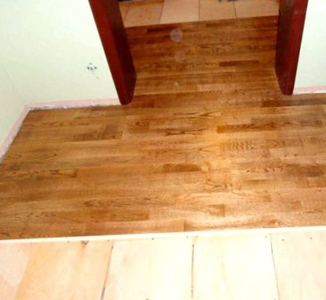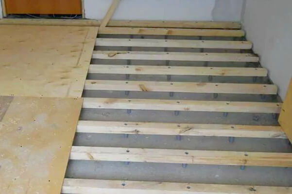 - Sur les planches. Ce choix est fait lorsque la promenade est déformée mais pas endommagée à l'intérieur. Le contreplaqué est vissé directement au sol ; s'il est abaissé, des entretoises longitudinales sont installées. Une autre option pour niveler la base consiste à utiliser des solutions polymères ou des mastics à prise rapide.