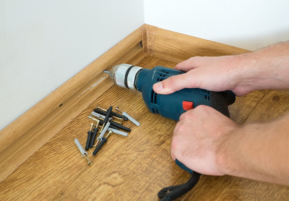 - Retirez les entretoises autour du périmètre de la pièce, installez le socle. Il est préférable de le fixer au mur afin d'exclure l'apparition de lacunes lors de la déformation thermique du revêtement de sol.