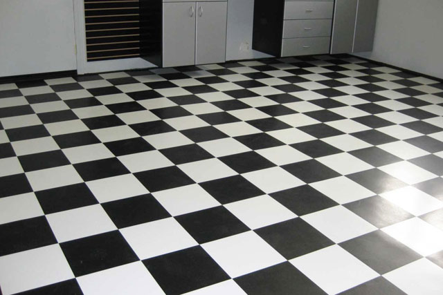 Cette méthode peut être utilisée pour la pose diagonale et standard. La disposition en damier des couleurs ne peut pas être utilisée si le sol présente des courbures, des renflements ou des dépressions, car la courbure des carreaux contrastants soulignera toutes les irrégularités et ne les masquera pas.