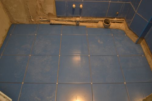 L'installation à sec est effectuée après le nivellement du sol. Le nombre de produits entiers dans une rangée est calculé, les zones d'installation des éléments taillés sont déterminées. Lors de l'aménagement, l'emplacement des toilettes, le pare-baignoire est pris en compte. La zone sous la salle de bain est considérée comme une zone distincte qui n'est pas associée à la zone du rez-de-chaussée si l'écran est placé avant les carreaux.