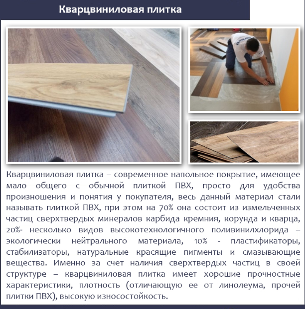 Certains modèles ont un support isolant thermique ou une couche adhésive. Le nouveau matériau n'est pas inférieur au stratifié populaire en termes de décoration et le surpasse en termes de performances. Dans la lignée des fabricants étrangers et nationaux, sols imitant divers types de bois et types de pierre, planches de parquet. La texture de la surface est lisse ou gaufrée (rugueuse, gaufrée, osier).