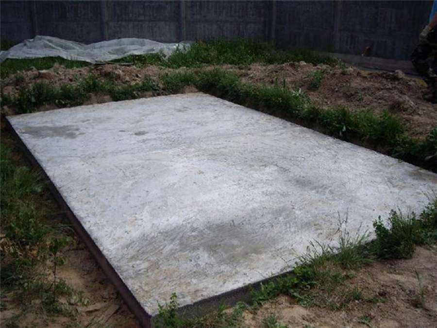 - Réalisation de fondations. La meilleure option est une dalle de béton armé, coulée sur une couche de sable et de gravier. L'épaisseur de la base doit être de 8 à 10 cm avec une élévation de 5 cm au-dessus du niveau du sol.Si le sol est humide et instable, des supports tubulaires ou à vis y sont en outre abaissés.