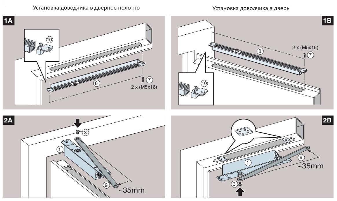 La méthode de montage supérieure est utilisée sur des vantaux de porte minces, car la charge tombe sur le cerclage supérieur de la boîte. Les inconvénients incluent la saillie du levier, mais pas à l'extérieur, mais à l'intérieur de la pièce. Le mécanisme est également facile à casser. La hauteur libre de la porte doit être d'une hauteur suffisante pour que le corps en haut ne gêne pas le passage dans l'ouverture.