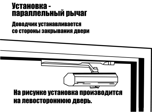 La méthode est complètement opposée au schéma standard. Un ferme-porte à levier est placé à l'intérieur de la pièce, alors que les charnières ne sont pas visibles, la toile s'ouvre sur elle-même.La boîte du mécanisme est placée sur le dessus du butin, et la semelle du levier est fixée sur la toile. Ainsi, vous pouvez installer un ferme-porte sur la porte d'entrée et sur les ouvertures intérieures si le système standard ne peut pas être utilisé.