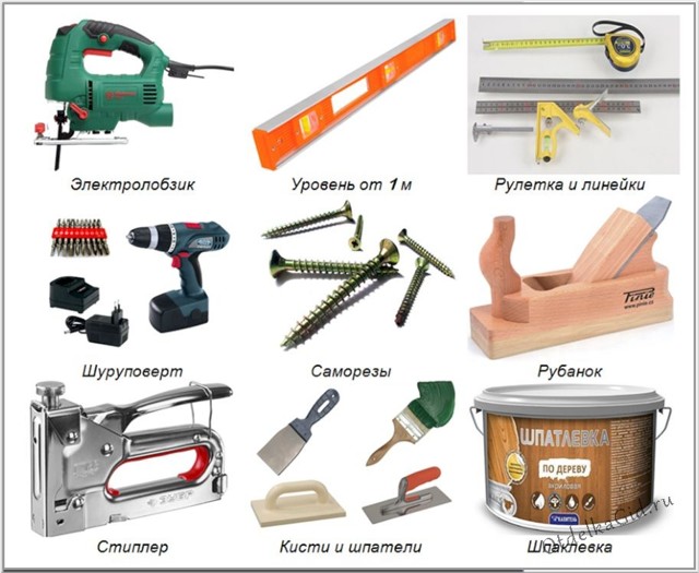 Un niveau laser est utile pour marquer les murs. Le traitement des éléments en bois est effectué avec un rabot, un ciseau, une meuleuse. Vous pouvez retirer les ongles tordus avec un arrache-ongles.