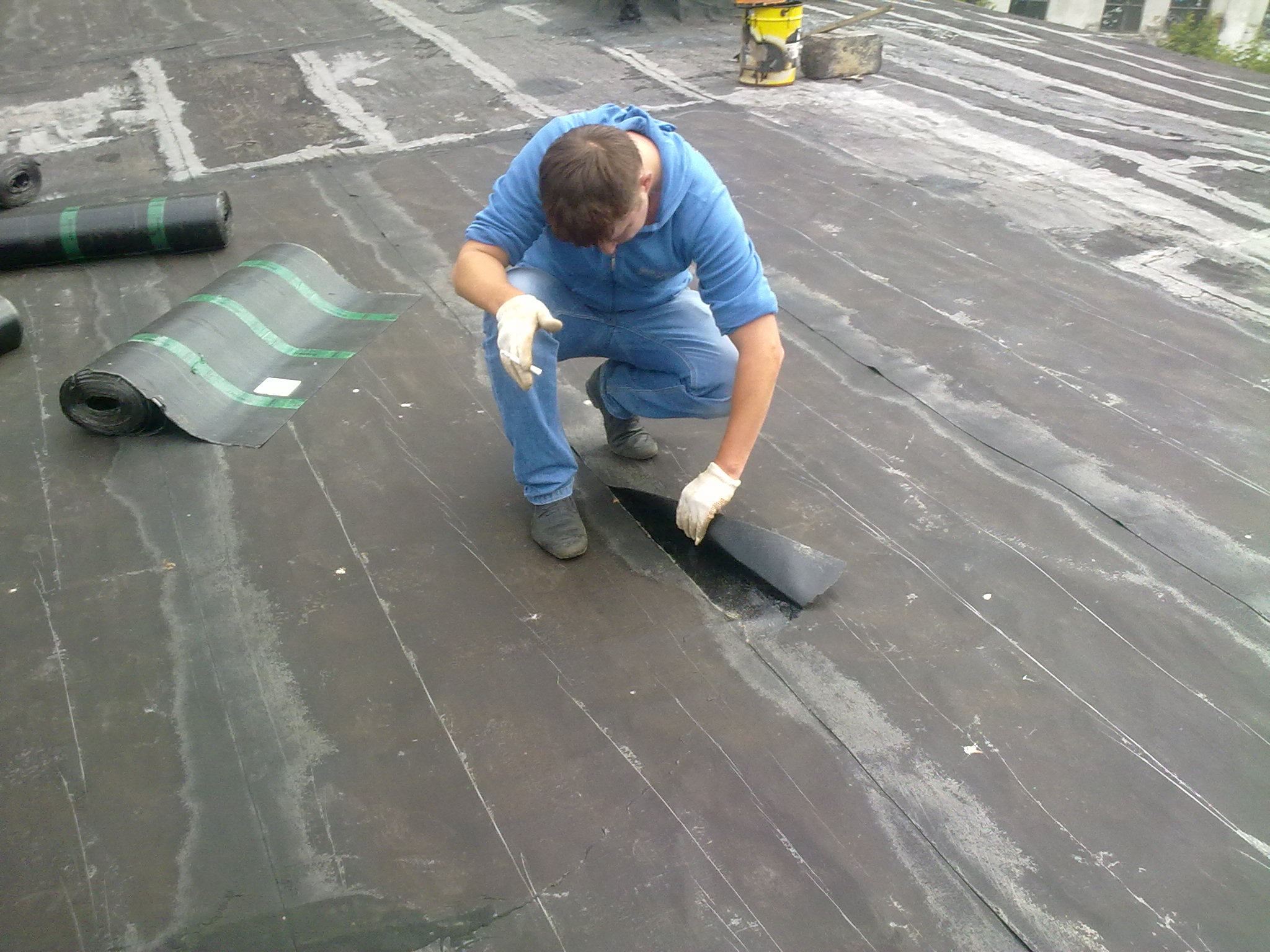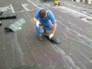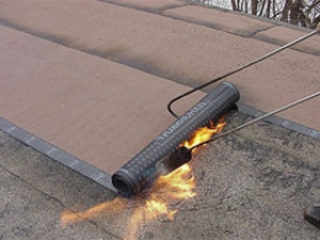 - Application du mastic et fixation du matériau. Ces manipulations sont effectuées presque simultanément. Le matériau de couverture est chauffé et pressé contre la base. Chaque nouvelle bande doit être superposée.