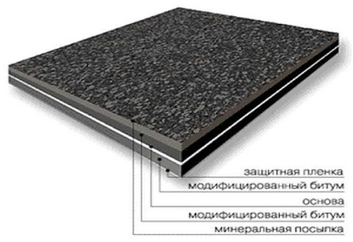 La base de la toile est en fibre de verre ou en polyester. Du bitume et des polymères y sont appliqués, ce qui améliore les propriétés de liaison. Un pansement minéral à grains fins ou grossiers sert de couche protectrice. Le produit est résistant aux facteurs biologiques. L'absorption d'eau quotidienne ne dépasse pas 1%. Les propriétés des liants sont réduites à des températures inférieures à -35 degrés.
