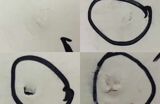 - Lorsque le matériau est gonflé, la bulle est perforée pour éliminer l'air. Le site de ponction est rempli de mastic.