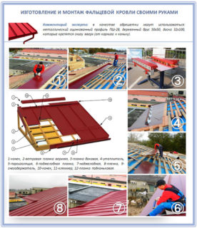 Pour le lattage, prenez des barres sèches (50 x 50 ou 40 x 50), qui sont nivelées dans un plan afin qu'il n'y ait pas de saillies et de dépressions. Ils sont fixés aux chevrons avec des vis autotaraudeuses, les joints sont réalisés sur le support en damier. Pour la fixation du revêtement métallique, de l'onduline, des clous à toiture avec un tampon absorbant les chocs sont utilisés. L'instruction pour l'installation du toit implique la production d'un dessin préliminaire avec des dimensions et un plan de toit.