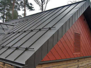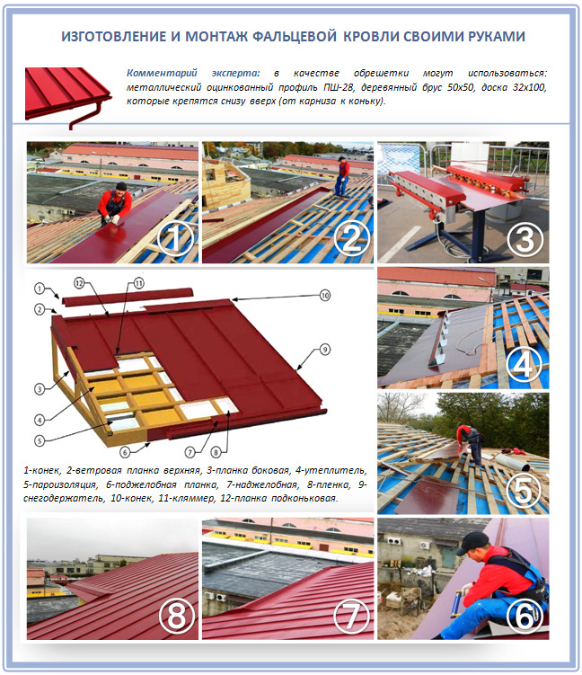 Pour le sertissage, on utilise des machines qui fixent le joint. La carte de couverture est assemblée en pièces, qui sont posées au sol, puis relevées jusqu'à la position d'installation. Pour la fixation à la caisse, des pinces (bandes métalliques étroites) sont utilisées. Si la pente des pentes est inférieure à 14 °, une base solide est réalisée et lors de l'installation d'un toit en pente de plus grande inclinaison, une caisse standard est installée.