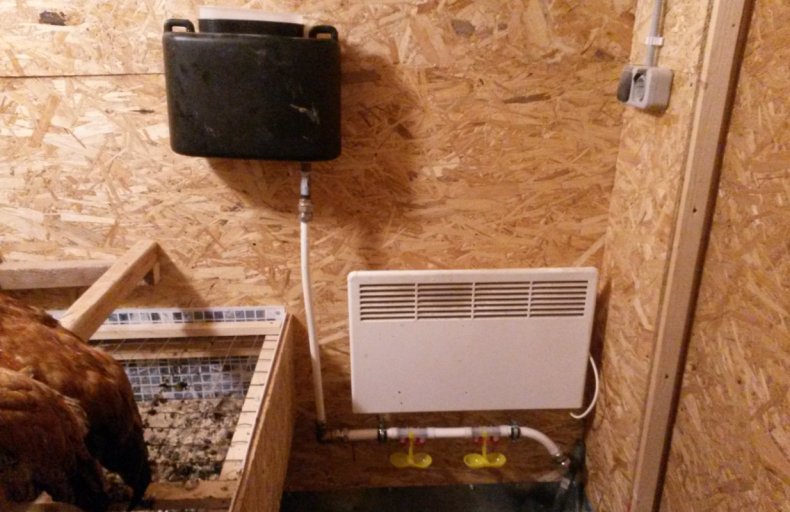 Les convecteurs vous permettent de réchauffer rapidement la pièce grâce au mélange accéléré de l'air. Des courants froids, passant près du corps, se réchauffent et montent au plafond, déplaçant une nouvelle portion d'air frais vers le sol, le processus se répète. Pour le poulailler, une version murale est choisie, car les poulets s'installeront sur les types de sol, contamineront la surface et renverseront périodiquement les appareils. Les convecteurs encastrés peuvent être intégrés dans des murs isolés.