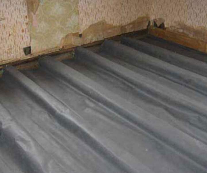 - Pose de la couche d'étanchéité inférieure. Il est réalisé avec un accès aux poutres par le bas. S'il y a de la terre sous les décalages, l'imperméabilisation est posée sur le dessus du cadre avec un remplissage dans les coins.