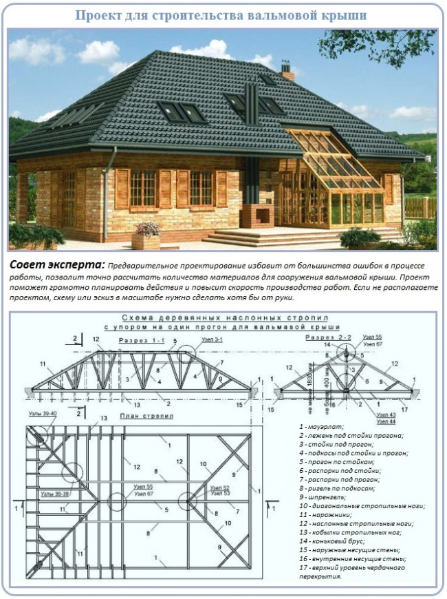 Les formules données ne peuvent être utilisées que lors du calcul des options les plus simples pour les structures de hanche.Il est préférable de confier le développement des dessins d'un système de chevrons avec une structure plus complexe à des spécialistes qualifiés.