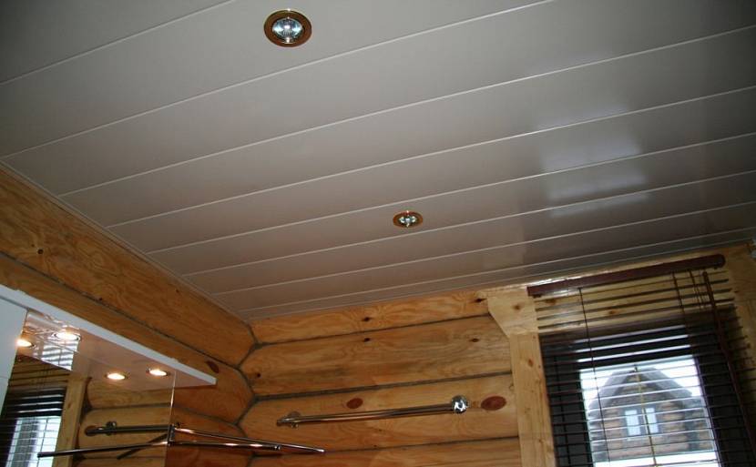 Le plafond de la salle de bain dans une maison d'un bar est souvent fini de la même manière: ils sont cousus avec des cloisons sèches ou même des lattes en plastique sont placées directement sur le cadre. Une option plus intéressante est une structure suspendue constituée de lattes métalliques ou d'un plafond tendu. Ce dernier est le plus approprié pour la salle de bain, car il ne craint pas l'humidité et les changements de température.