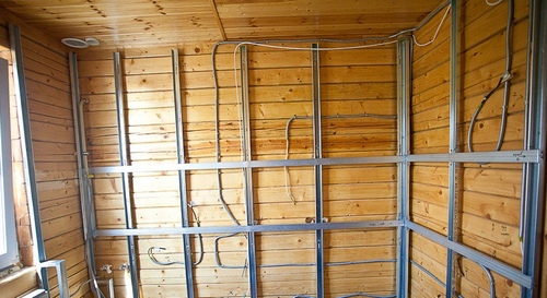 - Installation de plaques de plâtre. Pour les bûches de bois, des vis autotaraudeuses à filetage large sont utilisées, pour celles en métal - avec une petite. Le pas entre les attaches est de 20-25 cm.