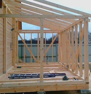 - Installation des pieds de chevron.Une extrémité est fixée sur la poutre, l'autre sur le cerclage supérieur du cadre.