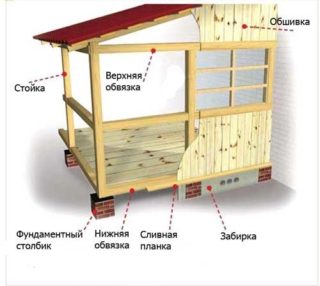 La clôture est faite si une véranda de type ouvert est en cours de construction. Tout d'abord, des balustres verticaux d'usine ou d'auto-fabrication sont installés. Après cela, des mains courantes sont posées sur eux, qui sont fixées de manière rigide sur les supports d'angle de l'extension.