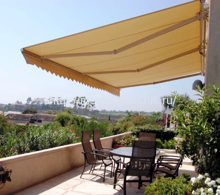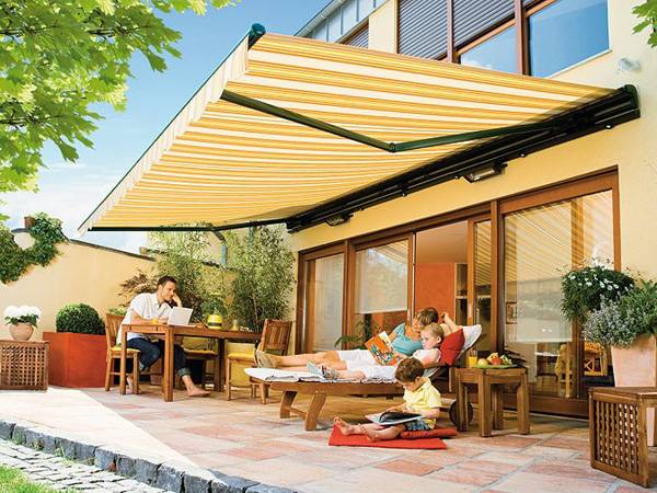 En général, un store de terrasse est un auvent dont la surface de travail peut être étendue, abaissée, inclinée. La conception est à bien des égards similaire à celle des stores intérieurs, seuls les auvents sont destinés à une utilisation en extérieur. La base en tissu est imprégnée d'une composition spéciale, de sorte qu'ils ne se décolorent pas au soleil, ne se mouillent pas sous la pluie et reflètent environ 90% des rayons du soleil. Les structures sont conçues pour une exploitation à long terme.