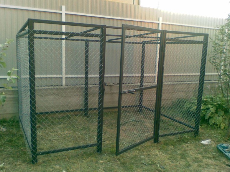 Le reste des côtés est recouvert d'un treillis métallique, utilisant souvent un "filet". Pour les gros chiens, le filet n'est pas toujours adapté, car ils peuvent blesser la bouche en essayant de ronger les tiges. Dans ce cas, il est préférable de souder une grille de renfort d'un diamètre de 6 mm. Le treillis ou le treillis est suspendu à des piliers en fer, des tuyaux ronds ou profilés sont utilisés.