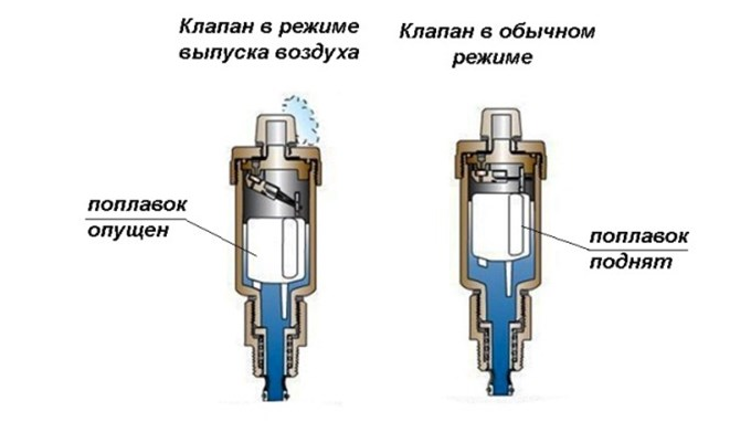 Dès qu'un bouchon se forme dans la canalisation, l'air va tendre vers le point le plus haut du circuit de chauffage. Si une vanne à fonctionnement automatique est installée à cet endroit, le caloporteur sera expulsé par l'air.Dans le processus de déplacement de l'eau, le flotteur descendra, ouvrant la vanne. En conséquence, de l'air s'échappera des tuyaux et du radiateur et l'espace sera rempli d'eau.