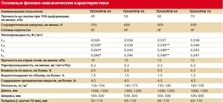 Les deux premières marques sont produites en plaques et en rouleaux. Le reste - le plus dense - uniquement en dalles. De plus, les produits diffèrent par leur épaisseur : pour des conditions normales, une couche de 50 mm est utilisée, dans des conditions extrêmes - 100 mm.