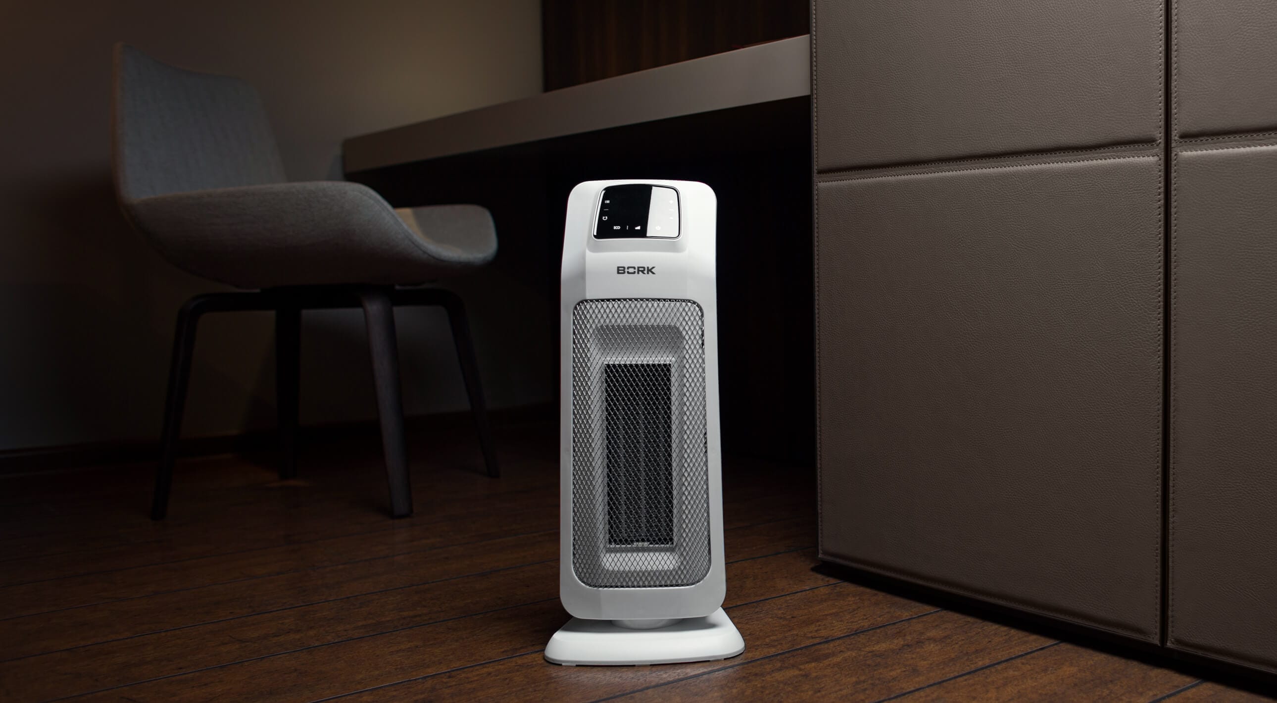 L'appareil élégant et efficace est équipé d'un élément chauffant en céramique. Ce modèle de plancher chauffant Bork est destiné à être utilisé dans les bureaux et les locaux résidentiels.